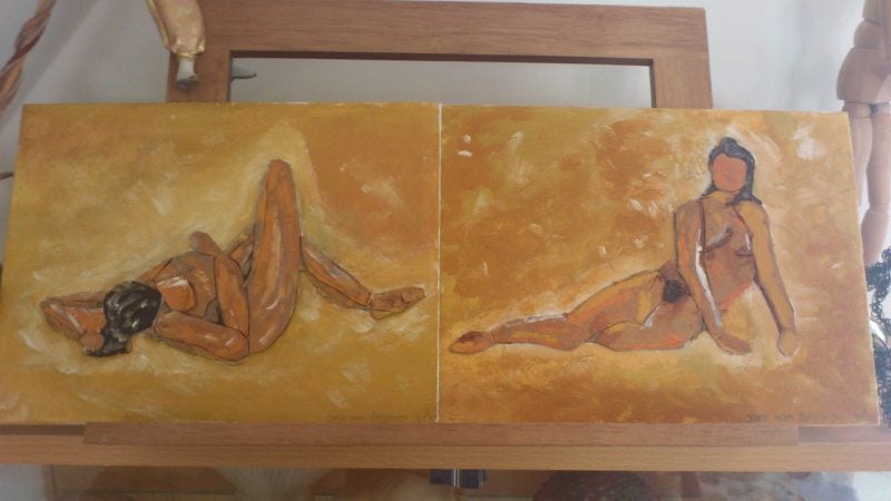 Deze twee vrouwen heb ik gemaakt in 2010. De vrouwen heb ik gemaakt van stukjes leer, vervolgens heb ik de achtergrond geschilderd en