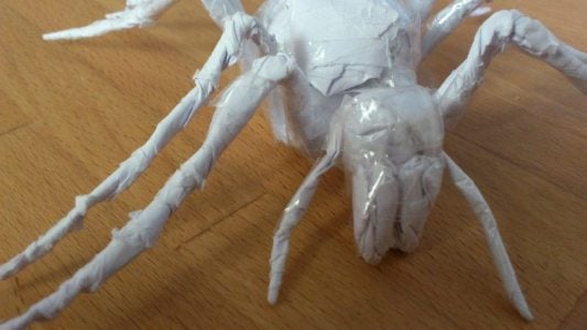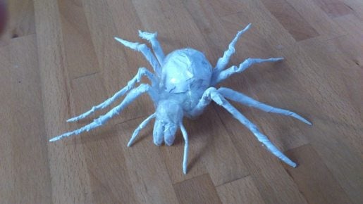 Deze spin heb ik gemaakt van papier en plakband. Het idee is ontstaan toen ik aan het leren was. Ik scheurde uit verveling een reep papier van het blaatje waarop ik rijtjes aan het schrijven was. Tijdens het stampen van de woordjes was ik een beetje aan papiertje aan het draaien. Toen ik er even naar keek had het bijna een volmaakte vorm voor een spinnenpoot (naar mijn idee). Dat werd de eerste poot van de spin die tezien is op de foto boven en onder.